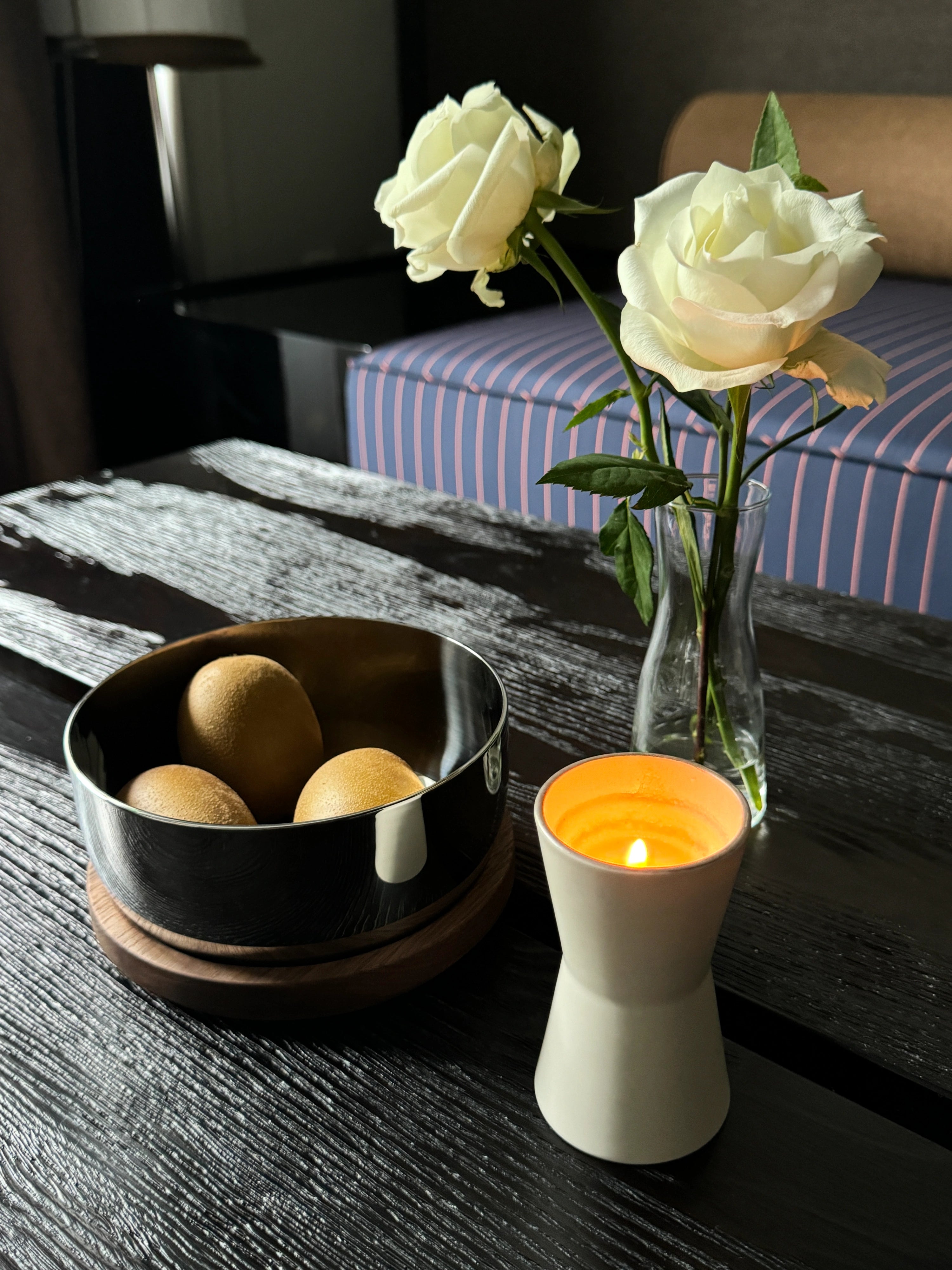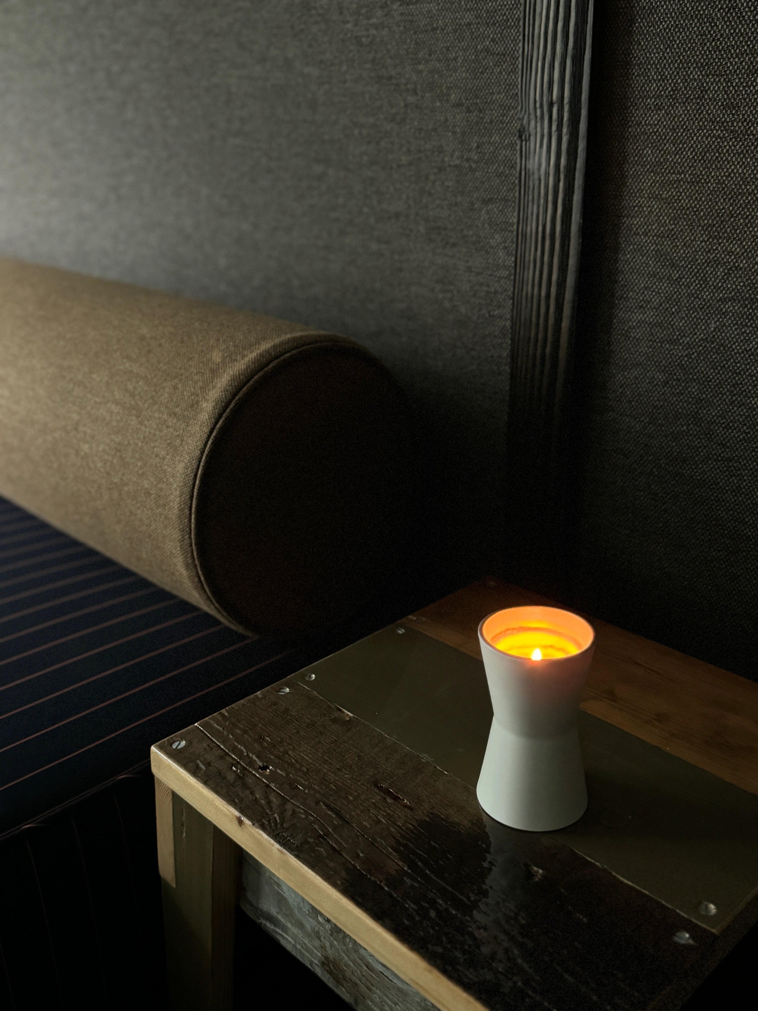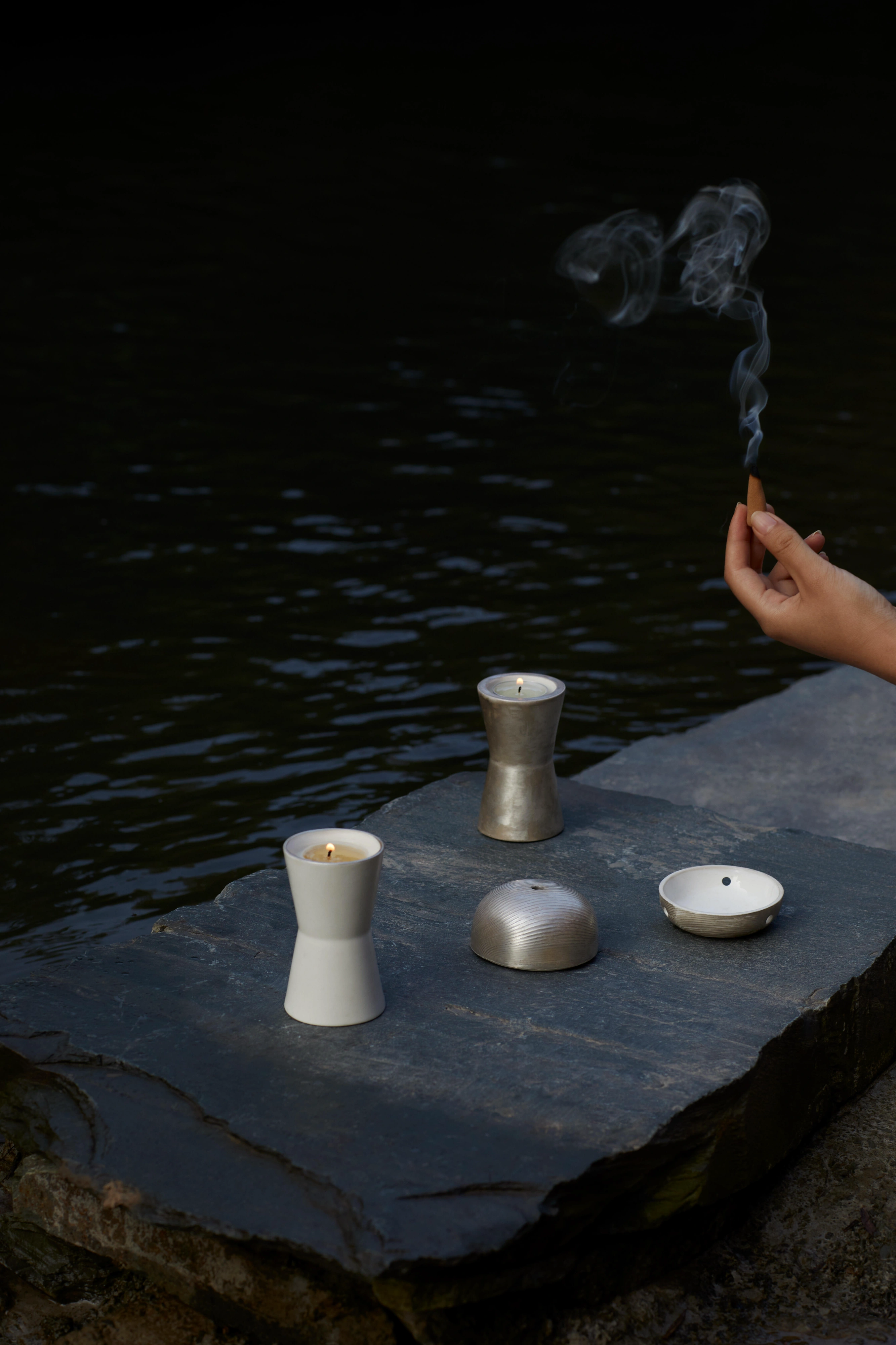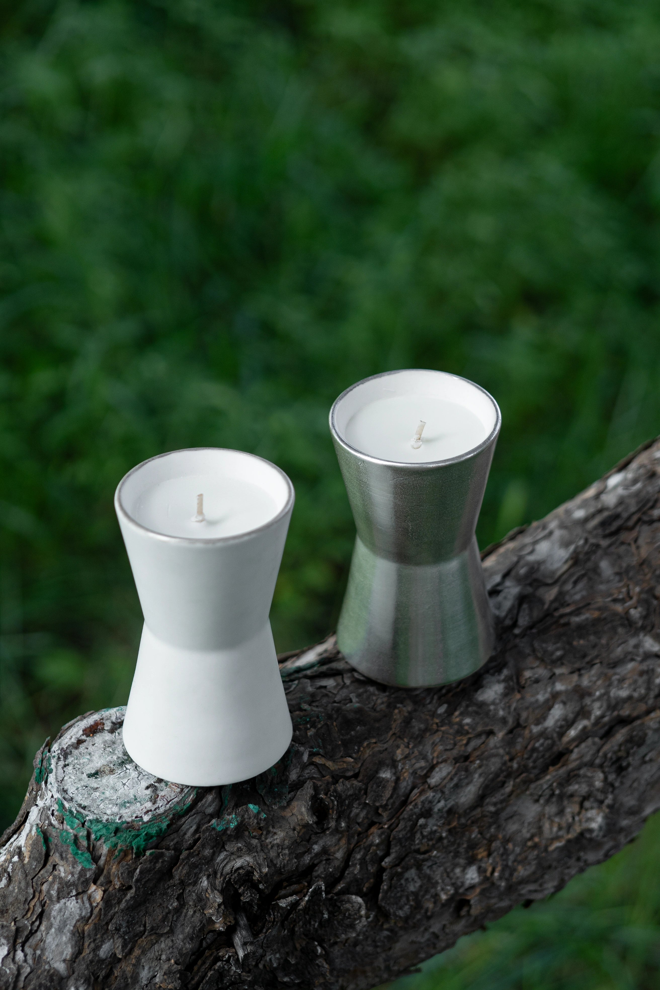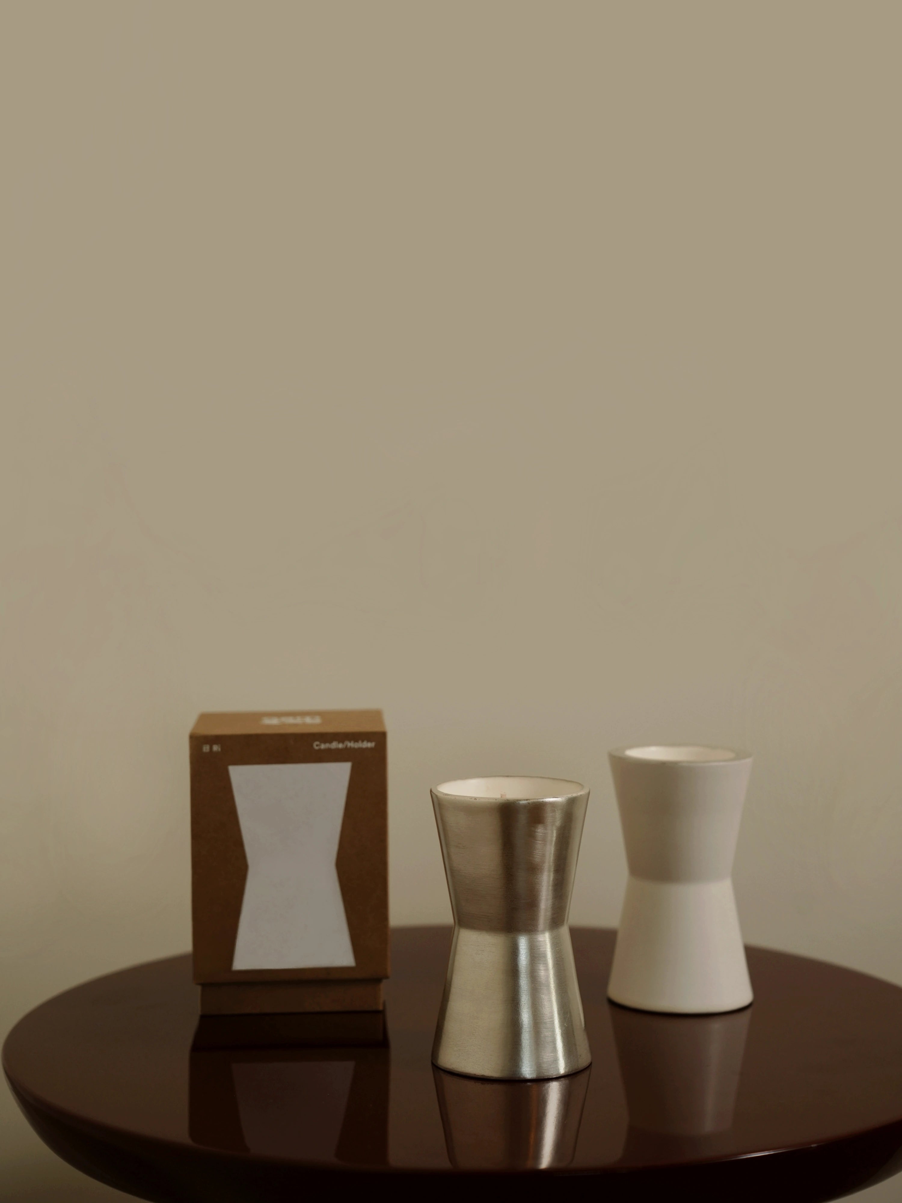 Coated in white and silver, Ri is both a candle and a scent holder.
